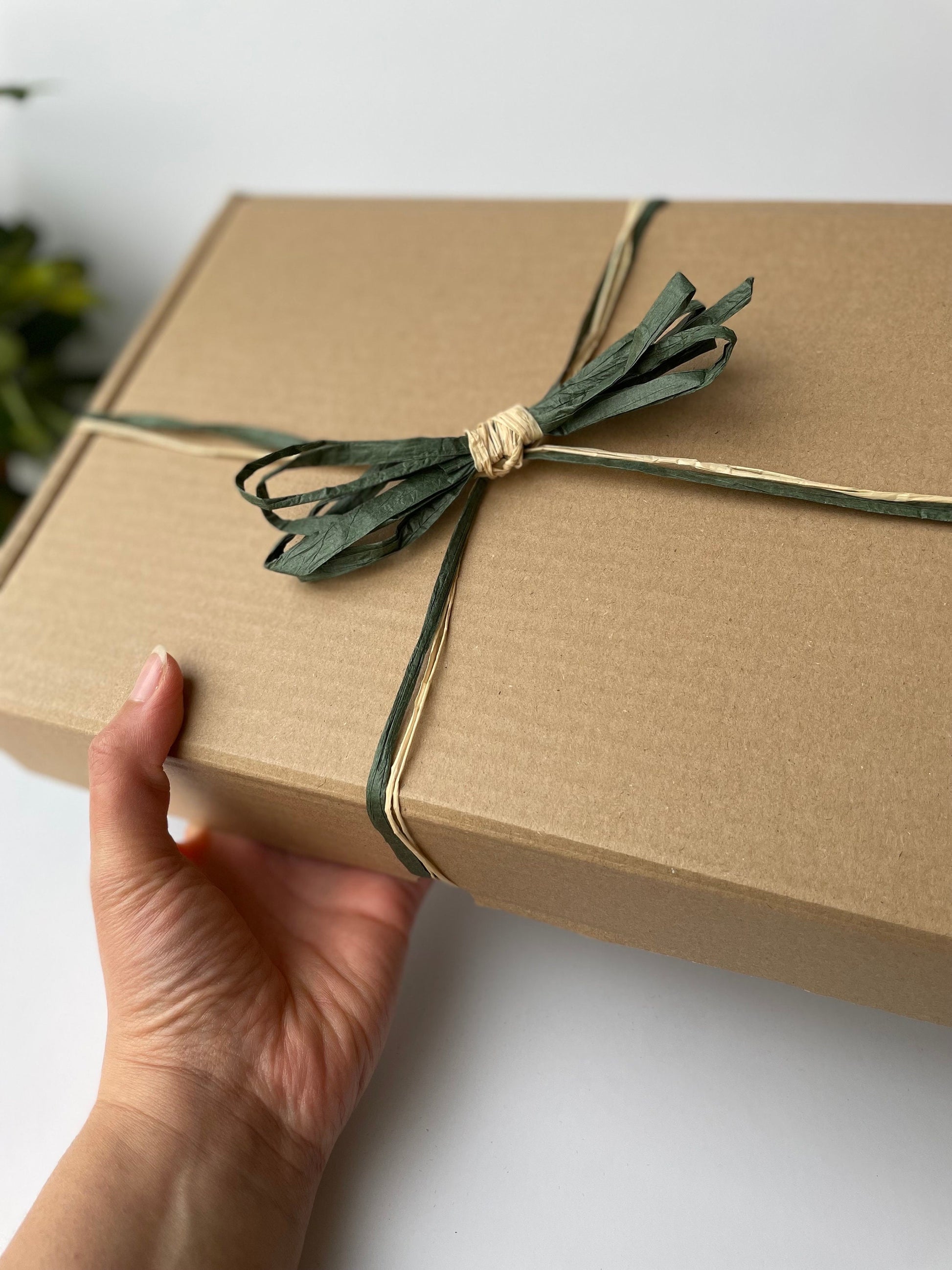🌿 Two types of raffia are tied around the box – the green paper raffia can be recycled or composted and the pale natural palm raffia can be composted.