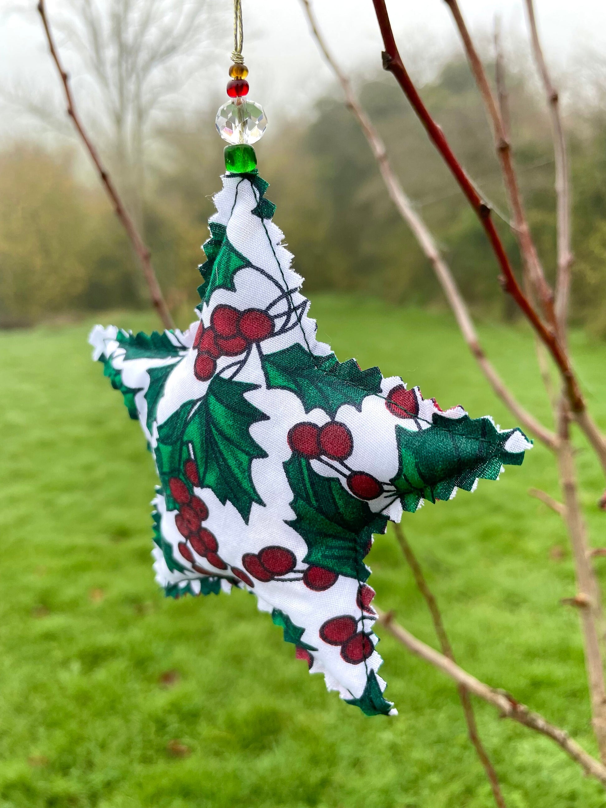 This decoration features holly pattern polycotton fabric filled with 100% upcycled content, making them at least 83% upcycled by weight overall.
